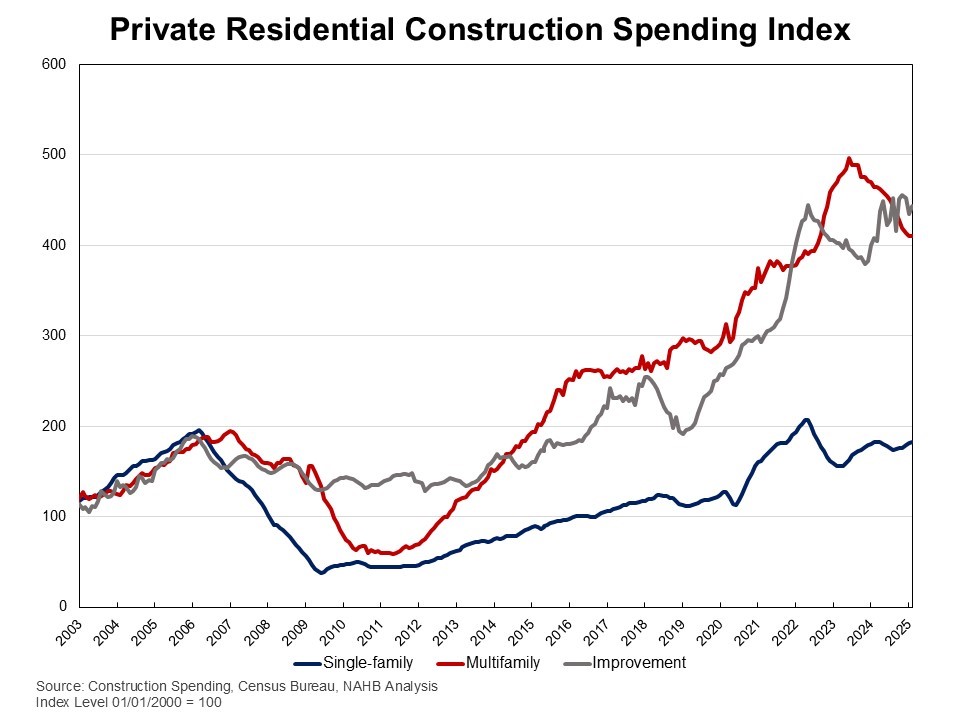 Private residential construction spending increased by 1.3% in February, rebounding from a 1.2% dip in January. The growth was largely driven by higher spending on single-family construction and residential improvements.